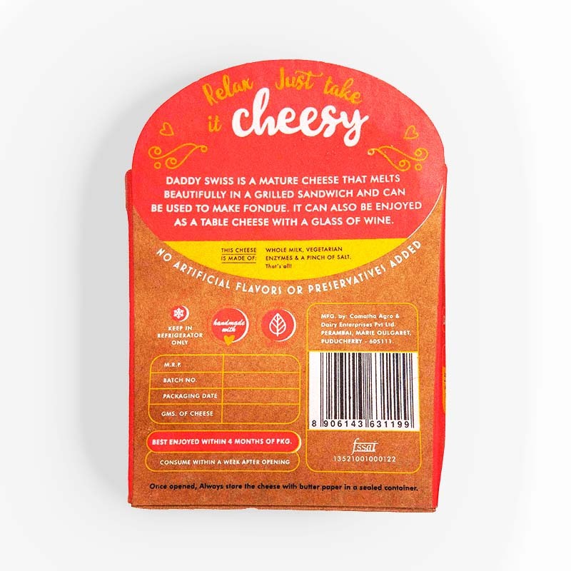 Aged for six months, Daddy Swiss Cheese offers a rich, buttery aroma with gentle notes of nuttiness, light sweetness, and caramel-like depth. Its semi-firm yet flexible body melts smoothly on the tongue, releasing a mild tang that adds balance and makes the flavour well rounded and memorable.