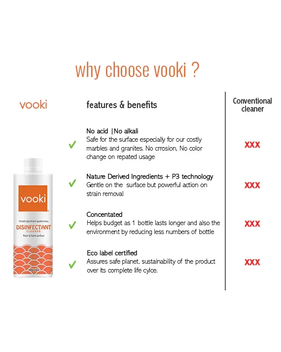 - Best Disinfectant spray from Vooki is a non-toxic specialized cleaning solution that kills 99.99% of germs from the floor. Its’ refreshing fragrance keeps your home fresh after every use. Buy best disinfectant floor cleaner that can be used on a variety of surfaces like granite, ceramic, marble mosaic etc.