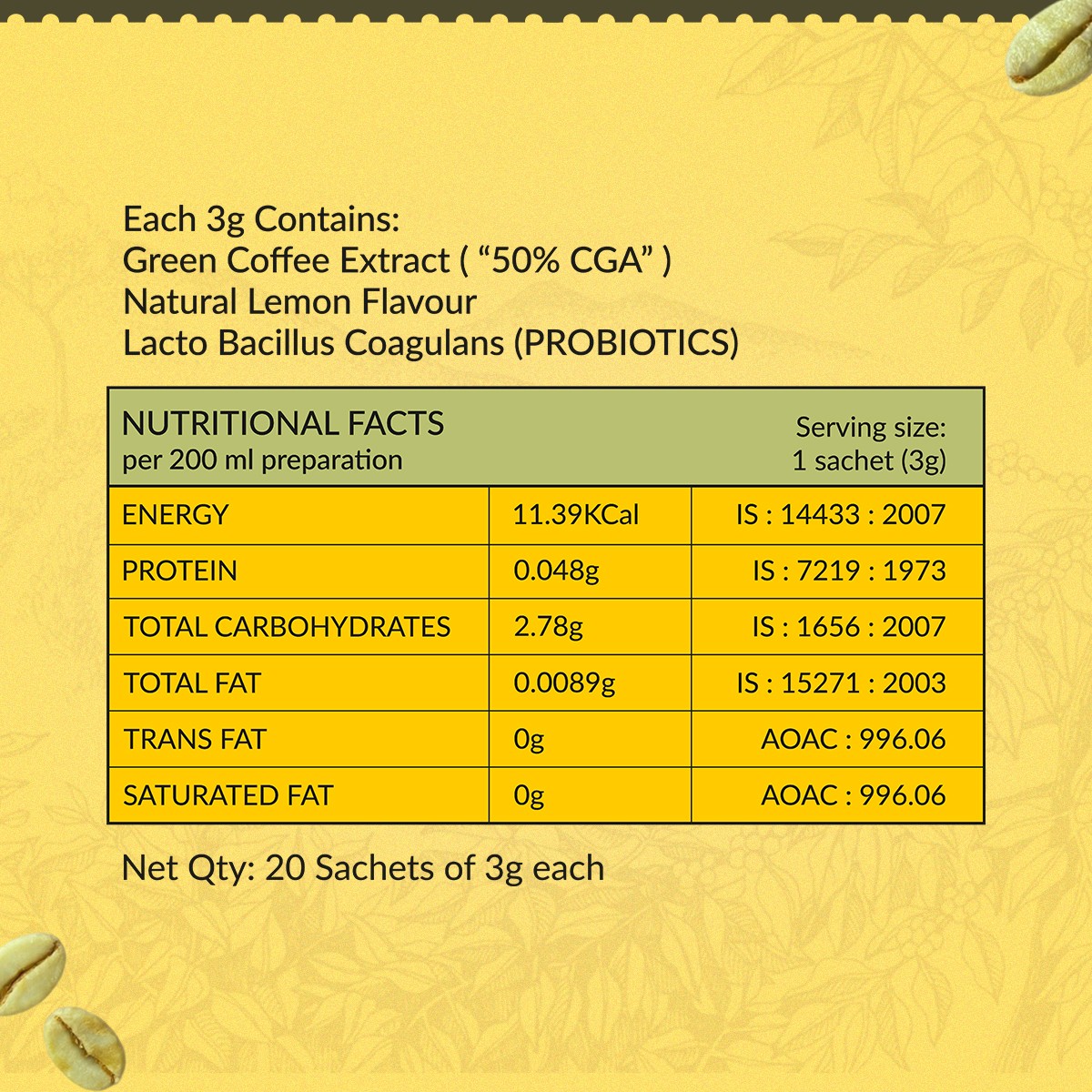 Ingredients: Green Coffee Extract ('50% CGA"), Natural Lemon Flavour, Lacto Bacillus Coagulans (Probiotics).