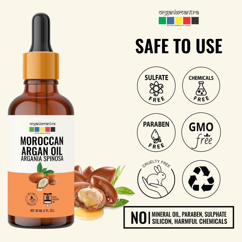 Organix Mantra Moroccan Argan Oil is 100% Pure, Cold-pressed, and Therapeutic grade Carrier Oil. It is extracted from the nuts of the Argan tree and is called Liquid Gold or Red Gold as it has the color of gold when extracted; the aroma of Argan Oil is sweet and nutty. The Oil has a myriad of benefits for skin and hair care as it is naturally rich in essential fatty acids, antioxidants, and Vitamin E. These are the nourishing nutrients that are much needed for both the skin as well as hair. Massaging your face with this Carrier Oil regularly is known to reduce dark spots, blemishes, acne spots, and acne breakouts while delaying the formation of wrinkles and fine lines.