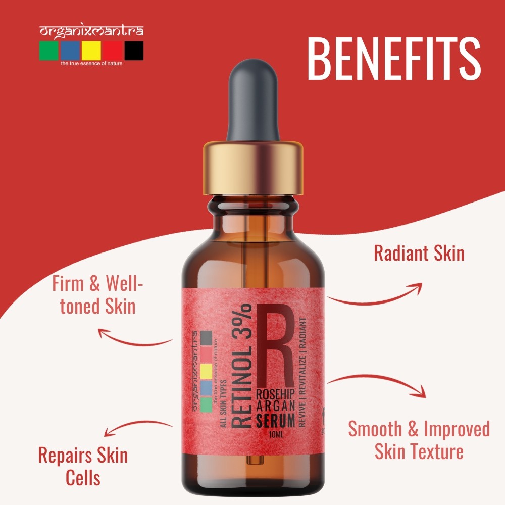 Retinol is a vitamin A derivative that is highly effective in reversing sun damage and signs of aging. Regularly applying Retinol serum is known to aid in cell turnover reduce fine lines, even skin color, improve texture, tighten pores, and stimulate collagen production. Organix Mantra Retinol 3% Serum for face is a balanced blend of Vitamin E, Hyaluronic Acid, Moroccan Argan Oil, and Rosehip Oil.