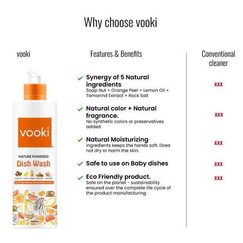 The synergy of 5 natural ingredients Soap Nut + Orange Peel + Lemon Oil + Tamarind Extract + Rock Salt is one of a kind a path breaking technology that makes dishwashing a safe and refreshing experience.