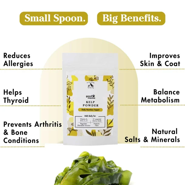 This nutrient-rich seaweed is brimming with essential minerals, fostering overall health. A rich source of a good source of iodine, potassium, magnesium, iron, calcium, vitamin K, B vitamins, iron, zinc and omega-3 fatty acids ensure a lustrous coat, while iodine supports thyroid function and metabolism.