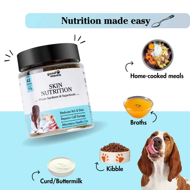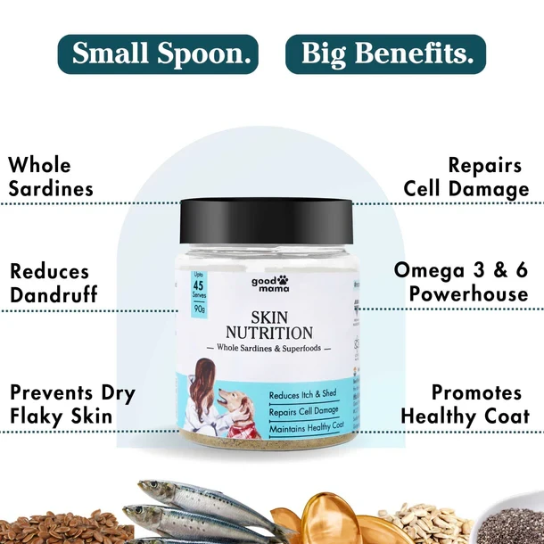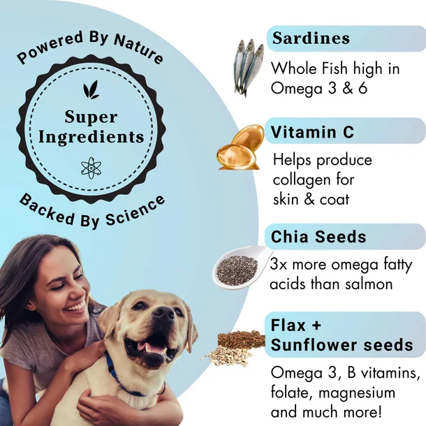 Transform your dog's skin and coat with our science-backed, all-in-one jar. Our nutritionist-crafted blend, brings together sardines, pumpkin seeds, flax seeds, vitamin C, vitamin E, and biotin-zinc, that nourishes, repairs, and rejuvenates . Say goodbye to dry, itchy skin and hello to a healthier, shinier coat.