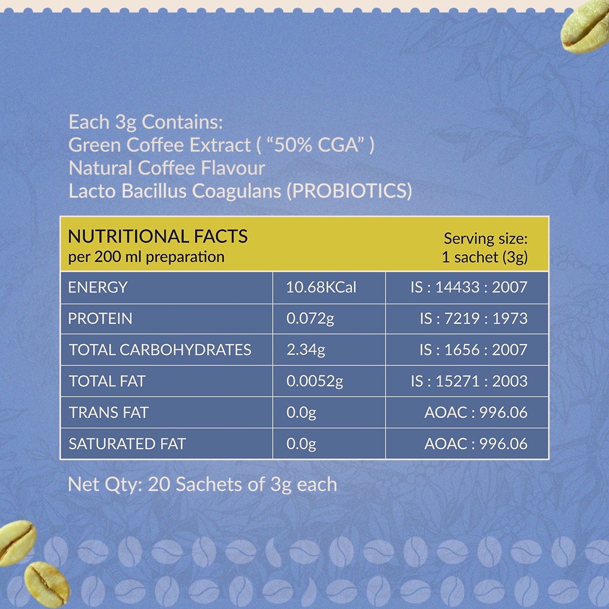 Ingredients: Green Coffee Extract ('50% CGA"), Natural Coffee Flavour, Lacto Bacillus Coagulans (Probiotics)